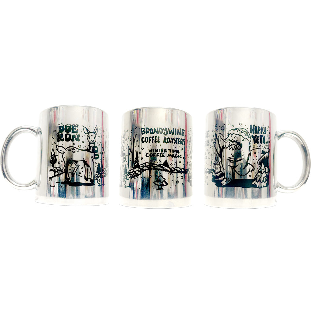 As shimmery as silver bells, get in the holiday spirit with our new silver Happy Yeti mug!! Dishwasher safe. DO NOT MICROWAVE!